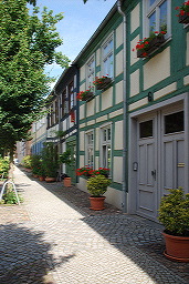 les vieilles rues rectilignes bordées de maisons à pans