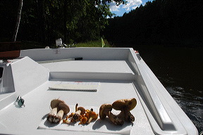 Au matin, grand beau et petite visite à la chapelle abbatiale du monastère cistercien ou ce qu’il en reste, puis cap au sud ! Nous retrouvons les paysages typiques de la Havel : petits abris en bois pour les bateaux, villages de vacances, maisons perdus sous les arbres, troupes de kayakistes qui flottent sur des reflets marbrés… Nous arrivons rapidement à l’écluse de Bredereiche et à sa porte en guillotine toujours aussi impressionnante. La petite ville étale ses chalets de vacances le long des rives, et l’on se sent un peu voyeur devant tant de bonheur paisible. Les paysages qui suivent sont bucoliques à souhait : grands pins, courtes prairies où paissent des vaches grasses, promeneurs, et berges bien propres. A l’écluse de Regow, nous profitons de la courte attente pour nous ravitailler en fromages de chèvres frais succulents. N’ayez pas peur de tester tout ce qui vous fait saliver, l’addition n’est pas salée, et le choix est vaste. Nous nous sommes arrêtés plus loin un peu n’importe où, à l’ombre de grands arbres, pour déjeuner tranquillement. Puis nous sommes allés faire une petite exploration digestive des sous-bois, et… nous sommes revenus lestés d’une dizaine de champignons : girolles et gros cèpes ventrus. Tout le monde à bord pense à la même chose : l’omelette bien baveuse qui nous attend le soir…
