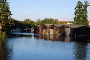 C’est après l’écluse de Schorfheide qu’il faut tourner à droite pour poursuivre vers Zehdenick. Le paysage change alors. Les roseaux réapparaissent, et avec eux, nénuphars, lentilles d’eau et petits boqueteaux. Le bateau avance lentement dans un soleil de fin d’après-midi calme et nous arrivons à Burgwall, sorte de faubourg de Zehdenick. Avant d’arriver, nous traverserons une zone où les pièces d’eau bordent la Havel, et où les petites marinas abritent de nombreux bateaux de toutes tailles. Sur les rives, des maisons aux pelouses impeccablement entretenues, dont un chalet de bois qui fait penser à la maison de Heidi, toute proprette, à l’herbe rase - rien ne dépasse -, avec des personnages en bois grandeur nature (un homme, une femme et une sirène, va comprendre…), le bois pour l’hiver bien aligné sous la terrasse, et un petit bateau sans une poussière qui attend devant avec sa capote bleue. Irréel. Je me demande si les occupants mettent smoking et robe longue pour dîner.