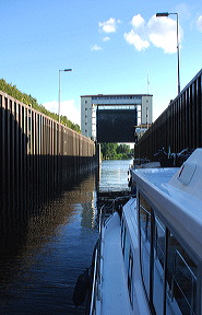 La sortie de la ville vers le Vosskanal s’effectue grâce à une écluse assez spéciale. On doit s’arrêter nettement avant, en fait dans le dernier virage, pour déclencher l’automatisme. Lorsqu’on sort de la marina, il faut donc revenir un peu en arrière. L’écluse est suivie quelques dizaines de mètres plus loin d’un joli pont levant, qui fonctionne en symbiose décalée, et s’ouvre à notre arrivée.