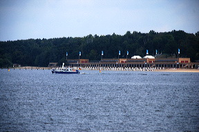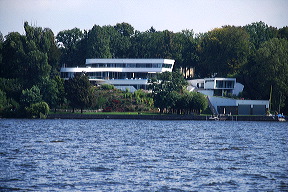Il faut contourner l’île de Schwanenwerder, aux maisons réservées aux happy few… Brad Pitt et Angelina Jolie étaient supposés en acheter une, si l’on croit la rumeur. Quoi qu’il en soit, elles sont magnifiques, immenses, et bien cachées des regards indiscrets. Plus populaire est la plage du Wannsee, l’un des lieux de détente favoris des Berlinois depuis longtemps. Les grands fauteuils d’osier formant cabine rappellent ceux des plages de la mer du Nord. Au fond de l’entonnoir, on passe sous un pont, et on change de monde. Il faut réduire les tours moteurs au minimum, pour ne pas faire de bruit, et ouvrir grand les yeux. Ici se cachent parmi les plus belles maisons de Berlin. C’est Wannsee. A la taille des bateaux amarrés devant, on imagine ce qui peut se dissimuler derrière les arbres. Lorsque ceux-ci le permettent, de grandes maisons aux jardins magnifiques se laissent admirer. C’est ce que nous faisons, à petite vitesse, comme pour une visite d’un Beverly Hills sur l’eau. Il en est de plus modestes, également, mais toutes ont un charme certain, un cachet qui les rendent uniques.
