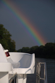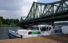 En face, c’est autre chose : le pont de Glienicker était celui où l’Est et l’Ouest échangeait les espions, comme Rudolf Abel et Gary Powers – le pilote de l’U2 – un petit matin de février 1962. C’est assurément l’un des ponts les plus célèbres du monde. Comme, sur l’eau, nous sommes libres comme l’air, nous décidons d’y déjeuner, et ô bonheur, il y a même une halte où nous pouvons nous amarrer. « Pique-nique à Glienicker », ça pourrait faire un bon titre de roman d’espionnage… Nous repartons vers 15h30 dans le Jungfernsee, suivi du Weißer see, qui contrairement à son patronyme n’est pas si blanc que ça, direction Ketzin. Le trajet est un peu monotone, et le ciel s’obscurcit derrière nous à la vitesse d’un peintre repeignant un mur. Nous croisons quelques péniches dans le Sacrow-Paretzer Kanal, chargées à ras bord de sable, et soudain, c’est magique, un arc en ciel superbe colore le gris de plus en plus ardoise du ciel. Je n’ai que le temps de faire quelques photos que de grosses gouttes étoilent le pare-brise. Ça ne dure pas, mais c’est très beau !