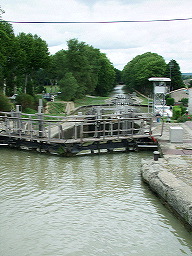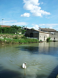 village de France. Nous repartons en franchissant l’écluse à la sortie de la ville, face à un vieux moulin magnifique gardé par un cygne solitaire. Le moulin a été transformé en restaurant, et sa treille ombragée est, ma foi, bien accueillante… |