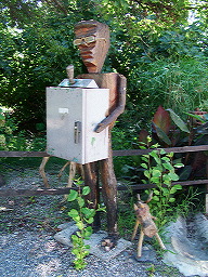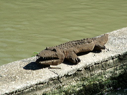 du bout des doigts, assis dans une main de bois géante. A la sortie