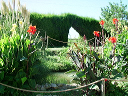 sculpture. Accueillis par une bordure de cannas rouges, jaunes et oranges,