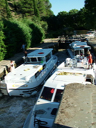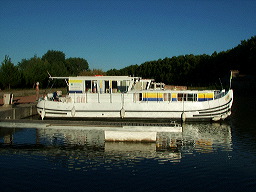 en bois vernis.Petite visite du village – nous avons le temps, maintenant – où une vieille bastide remaniée au XIVème siècle, après sa prise par Simon de Montfort, s’accroche à la pente de la butte. Le village est blotti autour de la vieille église, au milieu des vignes, et d’en haut, on peut apercevoir l’Aude qui serpente mollement dans la vallée. Nous parcourons les quelques ruelles aux maisons éclairées par le couchant d’une lumière dorée paisible, puis nous rentrons à bord faire un brin de ménage et préparer nos valises pour le lendemain. L’ambiance est mélancolique, du genre « fin de vacances »… ![]() C’est