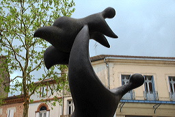 Derrière l’église, sur la place, se trouve une superbe balance comme on en voyait dans les débuts du XXe siècle, et une statue* ultramoderne de Jean-Louis Toutain, artiste toulousain dont on retrouve aussi les œuvres à Moissac.