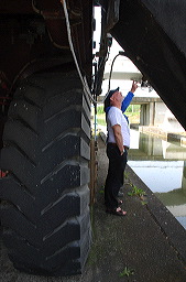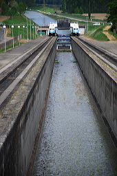 Car, pour un plaisancier, l’attraction principale de Montech est sans conteste la pente d’eau. Imaginez une paire d’autorails bleus montés sur des pneus gigantesques et reliés par une paire de poutrelles métalliques auxquelles serait attachée une pelle colossale, étanchéifiée par des rouleaux en caoutchouc. Cette dernière s’abaisse et obstrue un canal bordé de béton. Les motrices poussent l’eau devant elles, et s’appuyant sur un rail de béton central à la manière d’un monorail. Il n’y a plus qu’à remonter, avec le bateau à l’intérieur, arrimé à de gros boudins sur l’arrière. Dit ainsi, cela paraît simple, mais de près, c’est beaucoup plus impressionnant.