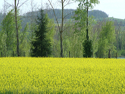 Les champs de colza plongent dans les bosquets verts, et dans les champs