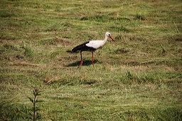 une cigogne qui enjambe l’herbe en dodelinant du cou. Cinquante