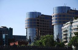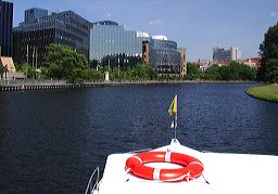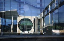 berges de la Spree se reflètent sur les immeubles de verre, chacun rivalisant avec le prochain en élégance et imagination. C’est le quartier des bureaux de Tiergarten. Les immeubles se mirent entre eux, créant des compositions étonnantes de couleurs et de formes. Sur la gauche les deux tours jumelles du Ministère de l’Intérieur participent au tourbillon général. La pénichette® avance