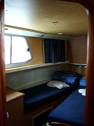 A l’avant, deux cabines, dont les lits se joignent pour former un