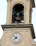 clocher carré où s’animent trois sonneurs de cloche