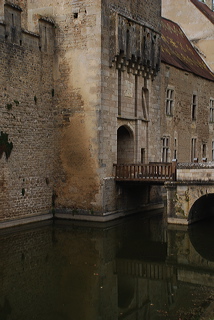 Nous partons néanmoins à la découverte du petit village. Sur les conseils de l’éclusière, nous suivons l’Axon, le petit ruisseau qui traverse le village, nous tournons à droite, et… nous découvrons, caché au milieu des arbres, entouré de ses douves, un château féodal du 12e siècle. Il fut restauré au 19e, et dans son état actuel est absolument magnifique, tel qu’on s’imagine les châteaux de l’époque : grosses tours carrées placées en angle dans des douves remplies d’eau, murs crénelés percés d’archères, Pont-levis dont les flèches ont disparu, mais dont la trace reste bien visible, logis seigneurial dans un état parfait de conservation, avec ses fenêtres géminées, et une toiture superbe de tuiles vernissées à motifs géométriques. Une splendeur. On ne visite pas, c’est une propriété privée. Dans l’immense cour du château, on entend des enfants qui jouent. Des adultes sont venus jouer, aussi, à diverses reprises, puisque renseignements pris, c’est ici que l’on tourna trois « Angéliques… » et un « Trois mousquetaires » signés Bernard Borderie, ainsi que « Clérambard » de Yves Boisset, avec Philippe Noiret.