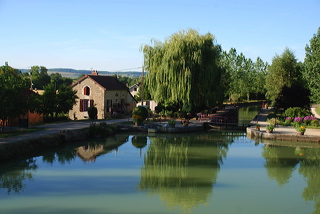 Nous repartons vers le bateau, en nous attardant dans le village devant un très vieux et très étroit pont de pierre, le « Pont des Romains », qui daterait en réalité de l’époque mérovingienne. L’église St Germain, du milieu du 14e siècle, est dotée d’une tourelle et d’un mur d’enceinte dont la hauteur varie entre 1,5m et 4m. Sous le porche, un ancien autel gallo-romain, et sur le mur du transept sud, une statue très ancienne mais très abîmée dans une niche (probablement une Vierge à l’enfant) et un cadran solaire très ancien, sur la droite.