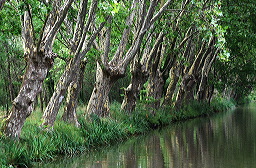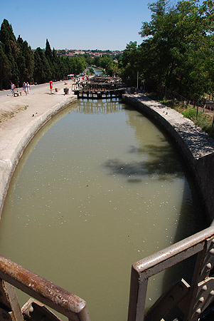 La suite du trajet se fait à travers les vignes. La Pénichette® flâne, se délecte, se bronze au soleil. C’est le farniente ambulant. Puisque nous avons le temps, il est peut être intéressant de revenir sur la forme si particulière des écluses du Canal du Midi. Les premières construites, vers Toulouse, étaient rectangulaires. Les murs latéraux, soutenus par de gros pieux de bois, avaient tendance à s’effondrer à vide sous la poussée de la terre. C’est ainsi que l’on en vint à cette forme ovale, qui permettait de répartir sur l’arrondi des bajoyer la poussée latérale, comme avec une voûte. Cela permettait en outre de faire pénétrer un nombre plus important d’embarcations dans le sas. Les écluses construites par Riquet mesuraient à l’origine un peu plus de 29 m. Beaucoup sont restées telles que, mais certaines autres ont été allongées lors de la mise à la norme Freycinet. Cette dernière n’a pas été réalisée entièrement, ce qui explique que les péniches de ce gabarit ne peuvent pas emprunter le canal dans son ensemble.