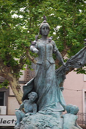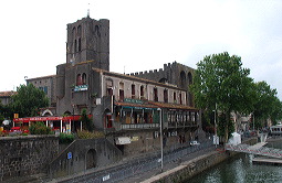 Pour aller en ville, il faut longer le canal, sous les platanes, ou emprunter la rue Raymond Pitet. On débouche ainsi sur l’Hérault. De l’autre côté du pont se dresse la silhouette crénelée noire et formidable de la cathédrale St Etienne, construite en pierre de lave.   Elle provient du Mont Saint-Loup, un volcan éteint depuis le pléistocène (-750 000 ans). Le site était un lieu de culte depuis fort longtemps, puisque la cathédrale est la fortification en 1173 d’une église romane du Ve siècle, elle même bâtie sur l’emplacement d’un temple grec dédié à Artémis la chasseresse, déesse de la Lune. L’intérieur est un bijou baroque délicat, qui tranche avec l’austérité de l’édifice : témoin le chœur et cette chaire en marbre remarquables de délicatesse, ainsi que l’orgue réalisé en 1990 par le facteur Gérald Guillemin dans le plus pur style romantique.
