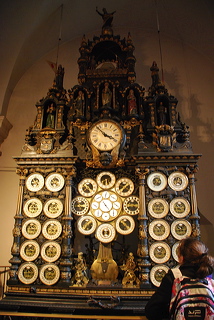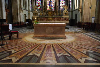 Tout à côté s’élève la cathédrale St Jean. C’est une construction assez originale : pas de portail principal, un clocher comtois à l’extérieur, et deux chœurs ! On rentre par une porte latérale en haut de la colline, et l’on découvre à gauche l’abside dite du Saint Suaire, car elle abrita ce qui était probablement une copie du Saint Suaire de Turin jusqu’à la Révolution. Sur le côté sud s’étire une succession de chapelles magnifiques, certaines aux plafonds richement décorés, comme celui de la chapelle du St Sacrement, où l’on peut admirer le tableau d’une Vierge à l’Enfant peinte par Domenico Cresti « Il Passignano » en 1630. Dans l’une de ces chapelles se trouve un autel circulaire en forme de chrisme en marbre blanc daté du 11e siècle tout à fait remarquable. Il est considéré comme l’un des plus beaux chefs- d’œuvres de la cathédrale. Sur un pilier voisin, on peut admirer une sculpture d’une Vierge à l’Enfant très ancienne. Remarquez également le dallage magnifique en marbres différents du chœur principal. Dans une des pièces de la tour se trouve la célèbre horloge astronomique du 19e siècle construite par Auguste-Lucien Vérité, reprise sur la base de celle de celle de Constant Flavien Bernardin quelques années auparavant, mais qui ne donnait pas satisfaction. Elle indique aux 57 cadrans du chef d’œuvre l’heure, les minutes, les secondes, les jours, les dates, les lunaisons, les saisons, les éclipses solaires et lunaires, les heures des marées, la date de Pâques, les solstices, les signes zodiacaux, et plus encore, mais pas l’âge du capitaine…