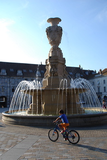 Il faut maintenant descendre la rue de la Préfecture jusqu’à celle-ci, puis se perdre dans les rues de la vieille ville. Vous y trouverez la place de la Révolution, l’un des rendez-vous incontournables des Bisontins ; le lycée où Pasteur fit ses études ; des fontaines magnifiques comme celle de la place Jean Cornet, avec, gravée sur le fronton Utinam(2) , la devise de la ville ; la fontaine des Carmes, de 1564, qui a récupéré son bras droit ; la fontaine des Dames (1785), où deux dauphins soutiennent une petite sirène en bronze ; et aussi quantité de beaux immeubles, certains très anciens, avec les devises des anciens propriétaires, comme la devise de la famille de Nayme , rue Claude Pouillet : « Sic pondere palma resurgit(3) ». Les immeubles 17e du quai Vauban semblent au garde à vous devant les bateaux qui passent, et, au début de l’île St Pierre, le Minotaure de Jens Boettcher semble échappé d’un garage pour géants. Au sol, vous verrez de petits triangles de bronze que vous pouvez suivre. Ils vous mèneront, en trois parcours délicieux, à la Citadelle, à l’église de la Madeleine, ou au musée du Temps. A vous de choisir.