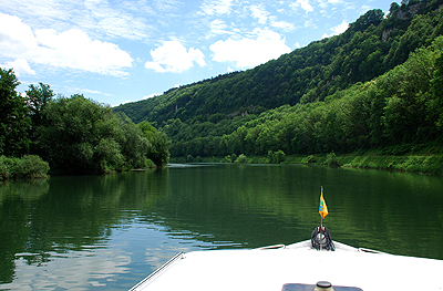 Nous remontons le courant, que l’on sent bien sous la coque, et passons devant le nouveau port de la Cité des Arts et de la Culture, quasiment désert. La navigation sur le Doubs est à envisager avec précaution. Le courant est important, et même assez fort en certains endroits, et il est impératif de rester dans le chenal, remarquablement balisé tout du long. Cette croisière est probablement l’une des plus belles en France, mais elle se mérite. Les paysages grandioses qu’on traverse, si on veut les apprécier en toute sécurité, nécessitent une attention constante à la route. Le fond est rocheux, et tous les bateaux ne sont pas logés à la même enseigne en termes de puissance.