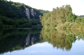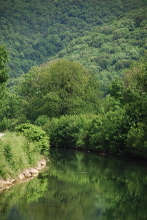 Nous repartons, et si le décor change un peu, devient plus bucolique, il reste toujours sublime. Cette partie de rivière est l’une des plus belles qu’il nous ait été donné à naviguer. Mieux que des mots, faites défiler le diaporama, et savourez… les kilomètres passent comme dans un rêve vert, où les réverbérations se mêlent à la réalité. Ce paysage est splendide, et les automobilistes qui roulent sur la berge ne voient pas la moitié de ce que nous voyons depuis la rivière. De temps en temps, nous avons l’impression d’être bénis des dieux. Après Ougney-les-Champs, de grands rochers abrupts plongent leurs reflets dans l’eau, et donnent une note monumentale à cette portion de parcours.