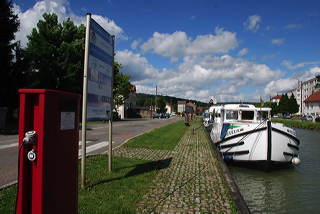 Le petit port est situé juste après l’écluse, en plein centre ville. Si vous avez besoin de vous ravitailler, sachez que le supermarché est tout proche, de l’autre côté de l’écluse. D’ailleurs, vous l’avez croisé en arrivant, car un quai permet de s’amarrer juste en face.