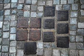 Le silence s’est fait d’un coup entre nous lorsque nous avons réalisé ce qu’étaient les petits pavés de cuivre. Il y en avait partout, noyés au milieu des pavés de granit des trottoirs. Ces petits clous carrés sont tous gravés de l'un des noms de ceux qui périrent ici.