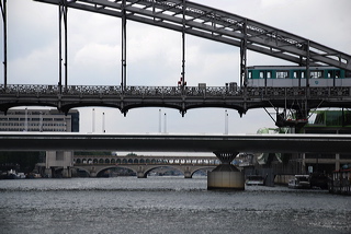 Voici Bercy, autrement dit le ministère des finances, pas si laid que ça finalement, et presque en face, la Bibliothèque François Mitterrand. Viennent ensuite le pont de Tolbiac, le pont National et le périphérique, puis l’ambiance change. Nous ne sommes plus à Paris, nous naviguons entre Charenton-le-Pont à gauche et Ivry-sur Seine à droite. Je précise, parce que l’immeuble qui se profile au loin pourrait laisser croire que nous avons par magie été transporté dans la chine éternelle. C’est Chinagora, une énorme pagode de cinq étages, aux toits verts et orange tarabiscotés, petit bout de Chine en terre d’Ile-de-France créé en 1992 pour faire office d’ambassade des délices de l’empire du Milieu, et de dépaysement total offert aux parisiens.