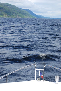 Nous profitons d’une percée dans le brouillard, et nous nous lançons dans l’inconnu, aventuriers que nous sommes. Visibilité : 150 m. Au fur et à mesure que nous avançons, le nuage recule, ce qui est plutôt bon signe. On doit lui faire peur. Après une heure environ de navigation, la vue s’est entièrement dégagée vers l’avant, et nous profitons même maintenant d’un petit rayon de soleil. De Nessie, pas de nouvelle. Nous avons beau scruter les flots à s’en exorbiter les yeux, il n’est nulle part. Plus nous avançons, plus le ciel tourne au bleu, mais le vent l’accompagne, et bien sûr, les vagues se réveillent petit à petit. Comme elles arrivent par l’arrière, ce n’est pas trop désagréable, mais au fil des minutes, elles prennent de l’ampleur et de l’écume perle sur la crête. Je n’aimerais pas être en sens inverse… Echaudé par des aventures lacustres agitées récentes, nous décidons de visiter maintenant plutôt qu’au retour le fameux Urquhart Castle, le château en ruine que l’on voit sur les cartes postales du Loch Ness. A défaut de Nessie… Il est situé au 3/4 du chemin, et possède un ponton, hélas celui-ci n’est pas abrité, et est régulièrement visité par les bateaux promenades touristiques. Nous préférons de loin le Drumnadrochit Harbour, payant(5) mais avec eau et électricité, d’où nous pourrons prendre un taxi(6) pour rejoindre le château à 5 km. Plus nous approchons, plus les vagues grossissent, mais nous doublons bientôt le promontoire du château, et tout s’apaise, à l’abri des montagnes. Trois minutes plus tard, nous avons de la visite : un colvert à l’accent écossais arrive en volant et se pose sur le roof avant. Malgré l’accent, nous comprenons assez vite ce qu’il veut : quelque chose à manger. Une bonne âme que je connais bien lui fournit aussitôt du pain aux céréales, et cela semble le satisfaire. C’est « La Boudeuse(7) » arrivant dans les îles et recevant la visite des populations locales…