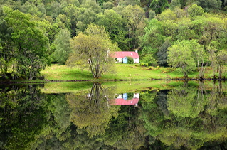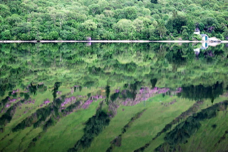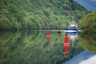 C’est à partir de l’Aberchalder Bridge que la magie a commencé. Une eau sans la moindre ride, comme si jamais nul être vivant ne l’avait effleurée. Dedans, les montagnes, les sapins, les rhododendrons, et les nuages qui flottent, bas, irréels, à quelques dizaines de mètres au dessus de la surface du Loch Oich. Une île minuscule au milieu du lac prend tout à coup des airs d’Avalon. Nous naviguons sur une légende celtique et nous nous attendons à voir surgir la Dame du lac à tout moment. Même les fleurs sur la berge dégagent quelque chose d’onirique… C’est alors que le Forth Sentinel a surgi de nulle part, reflet bleu et jaune sur fond vert. Nous nous sommes croisés, fin du miroir.
