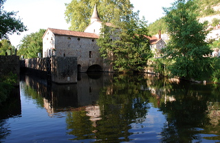 Quelques kilomètres plus loin, on entre dans Cahors par la plus belle porte qui soit : le pont Valentré(3). Médiéval, formidable, inquiétant, construit par le diable en personne dit la légende. On l’aperçoit, tout en haut de la tour centrale, grimper le long d’une arête. La légende est jolie : l’architecte n’arrivait pas à terminer le pont. Alors, il vendit son âme à Satan, à condition que celui-ci finisse les travaux. Mais pour transporter l’eau, l’architecte donna une passoire au Malin, et sauva ainsi son âme… et le pont ! À l’écluse, juste dessous, nous avons été accueillis par un S.D.F. qui gagnait quelques pièces en manœuvrant les portes avec le sourire. Il a rendu 2 équipages heureux de pouvoir soufflerun peu. Quelques mètres après le ponton d’accueil amont, un quai de pierre avec anneaux permet de contemplerles eaux vertes de la fontaine des Chartreux.C’est ici que l’histoire de Cahorsa commencé, par un culte à la déesse celte des eaux Divona(4),à l’origine du 1er nom de la cité : Divona Cadurcorum. Les gaulois Cadurques, ou Cadurci, donnèrent, eux, leur nom au Quercy, leur territoire. La suite est prestigieuse, tant sous les Romains d’un point de vue commercial, qu’au Moyen Âge, où l’université créée par le pape Jean XXII en 1332 devient l’une des plus célèbres de France. La résurgence donne cette couleur caractéristique, mais l’eau est très pure. En1362 les Chartreux y construisent un moulin, et baptisent la fontaine. Au XIXe, la ville construisit un petit édifice de pompage pour alimenter Cahors en eau potable.