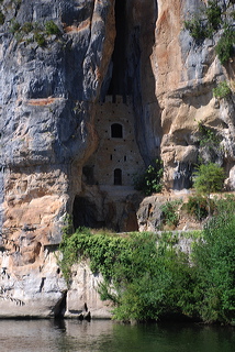 Nous sommes repartis le lendemain matin, pas trop tôt. Autour de nous, des murailles de pierre entourées de vert s’élancent à plus d’une centaine de mètres en hauteur, nous obligeant à lever les yeux. L’écluse de Planiols, puis celle de St-Géry amorcent un trajet de plus en plus rocheux. Des trous énormes grêlent les falaises, et les bateaux croisés paraissent minuscules dans cet univers de géants. Nous passons Bouziès-Bas, qui se reflète dans la rivière. Le village a l’air bien joli, mais aucun ponton ne nous permet d’aborder. Après l’écluse, nous voici face à une passerelle suspendue entre la roche et le village de Bouziès. Deux pontons accueillent les bateaux à passagers de Lot croisières(9) qui emmènent leur flot de touristes vers les falaises en amont et St-Cirq-Lapopie, et les bateaux de location amarrés en épi. Il reste encore des places pour passer un moment, et après le déjeuner, nous faisons quelques pas dans le hameau, puis nous empruntons la passerelle afin de contempler de plus près le "défilé des Anglais" enchâssé dans la roche sur l’autre rive. Au XIVe siècle, le Lot était la seule voie de communication. Des brigands s’installèrent donc dans différents repaires troglodytes pour rançonner les voyageurs et razzier les villages. Celui-ci est le plus fameux. C’est entre autres de ce repaire inexpugnable que partaient les expéditions contre les Français pendant la guerre de Cent Ans.