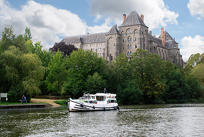 Trois kilomètres plus loin, à la sortie du bras de l’écluse de Solesmes, c’est le choc. La formidable abbaye de Solesmes emplit l’espace de ses hauts murs. Evidemment, il faut s’arrêter, c’est l’un des temps forts de la croisière, et pour cela, il existe deux pontons, avant et après le pont.