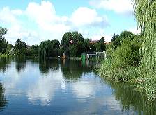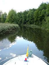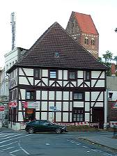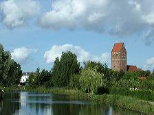 Après le petit bac de Slate, qui permet aux habitants de traverser le canal sans aller jusqu’au pont, plus d’un kilomètre plus loin, on arrive à Parchim (prononcez Parkim). Sur la droite, la grosse tour carrée de St Marienkirche domine le bourg… et l’écluse.