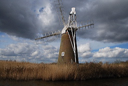 Le panorama ressemble beaucoup à l’intérieur de la Hollande, avec ses roseaux, ses vastes étendues plates, ses petits canaux d’irrigation, ses prés d’herbe rase et ses moutons de temps en temps. Dans ce paysage qui aurait ravi Bruegel ou Turner, plat et quelque peu désolé, on aperçoit d’anciens moulins de briques noircies par le temps ou fraîchement repeints en blanc, dressés comme des coulemelles au milieu des champs. Les moulins des Broads sont très différents des moulins hollandais : plus petits, en briques, et arrondis comme d’anciennes tours de guet, ils jalonnent la campagne avec leurs toits ronds et blancs, leurs ailes souvent déplumées, et un appendice arrière muni d’une seconde éolienne en perpendiculaire qui les fait ressembler à des hélicoptères qui auraient mal fini. Il ont été construits pour la plupart par des ingénieurs venus de Hollande au cours du 17e siècle pour assécher les sols encore spongieux, et pas pour moudre un grain qui n’existe pas par ici.