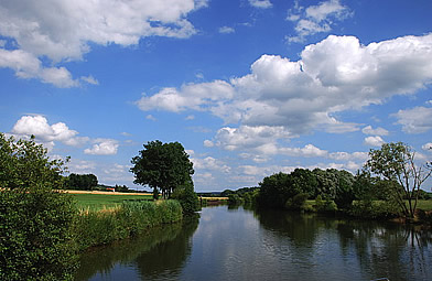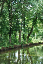 fronts d’arbres, sur un canal lisse comme une peau de jeune fille,
